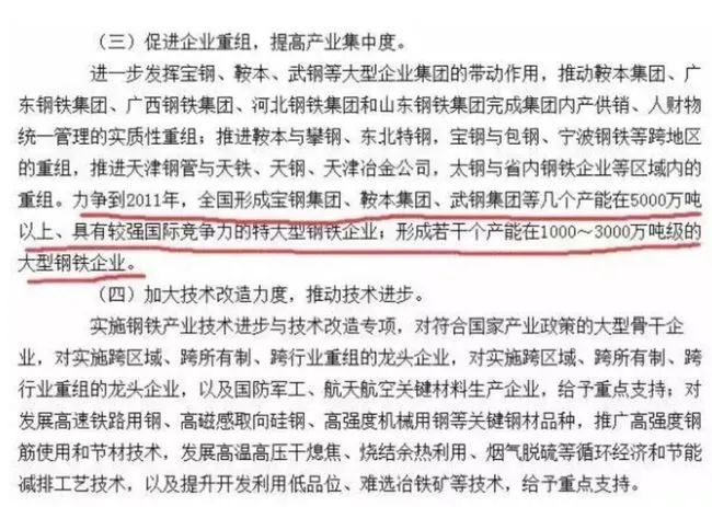 文件中提到:力爭(zhēng)到2011年,全國(guó)形成寶鋼集團(tuán)、鞍本集團(tuán)、武鋼集團(tuán)等產(chǎn)能在5000萬(wàn)噸以上的特大型鋼鐵企業(yè);形成若干個(gè)產(chǎn)能在1000萬(wàn)-3000萬(wàn)噸級(jí)的大型鋼鐵企業(yè)。