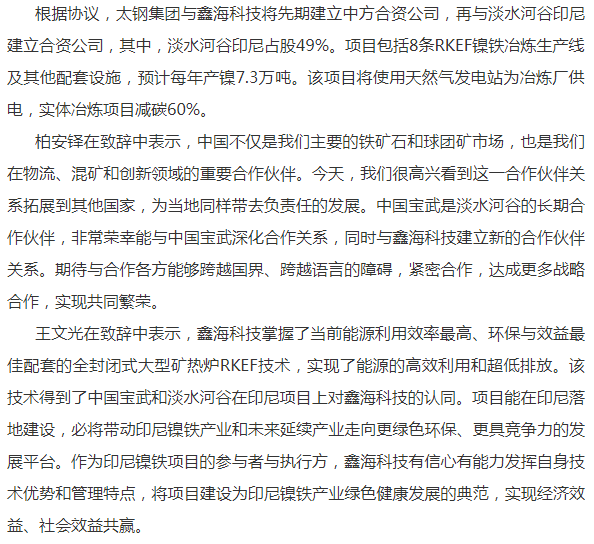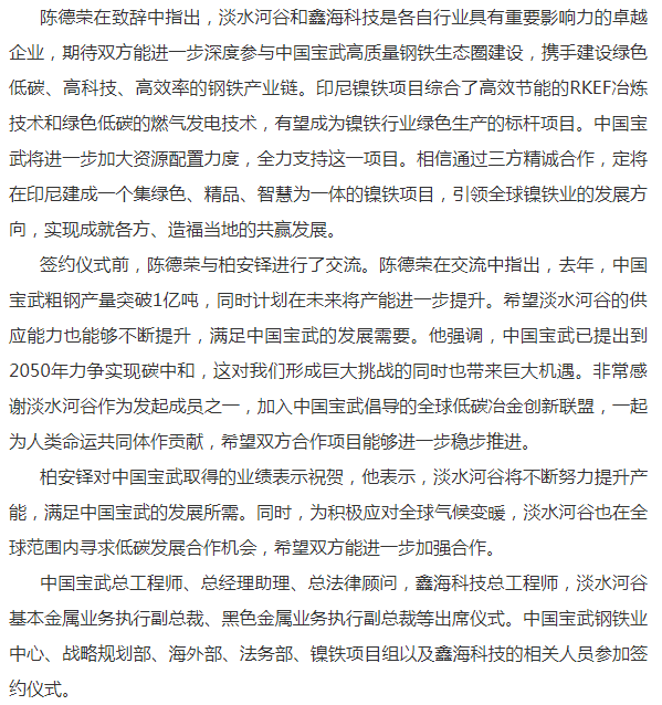 中國寶武、淡水河谷、鑫海科技合作建設運營印尼巴哈多比鎳鐵項目