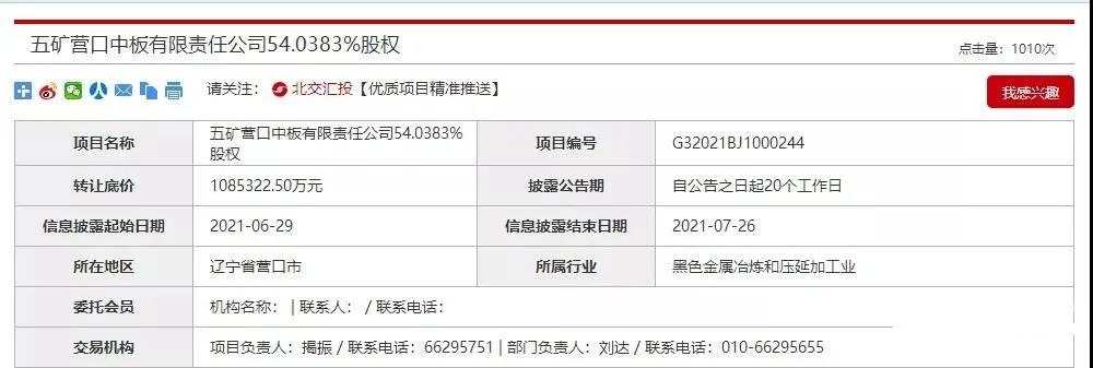 近日中國五礦集團有限公司旗下五礦營口中板有限責任公司(簡稱“五礦營鋼”)54.0383%股權轉讓項目在北交所正式披露,轉讓底價約108.53億元。該項目曾于今年5月18日在北交所進行信息預披露。