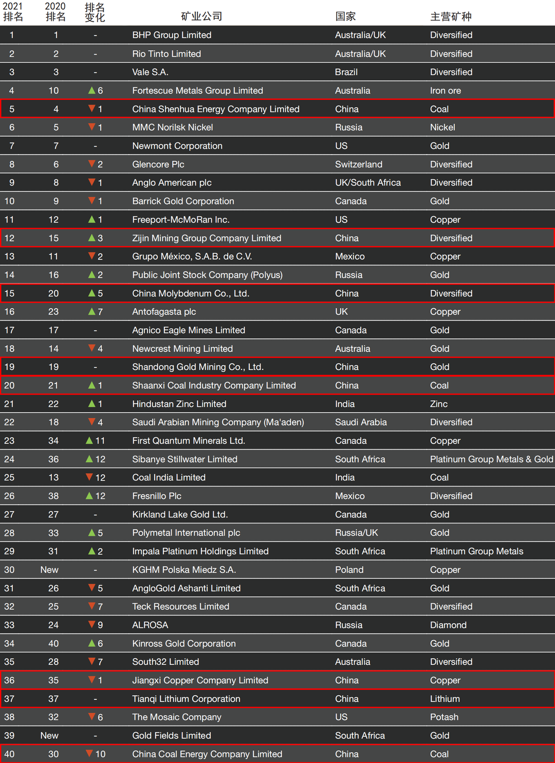 多元化企業巨頭必和必拓和力拓公司繼續保持榜單前兩位,淡水河谷位居第三,而鐵礦石巨頭福蒂丘金屬集團排名上升六位至第四。中國礦企的表現穩中有升,共有8家企業上榜。神華能源位居第五,紫金礦業緊隨其后(12)。此外,洛陽鉬業(15)、山東黃金(19)、陜西煤業(20)、江西銅業(36)、天齊鋰業(37)、中煤能源(40)也進入榜單。
