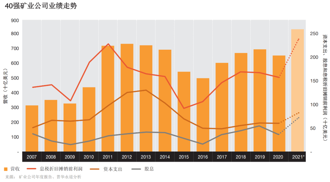 報告預計,對于全球最大的礦業公司來說,情況將會變得更好。普華永道對2021年的預測表明,前40大礦業公司的收入和EBITDA(息稅折舊攤銷前利潤)水平都將達到過去18年的最高紀錄,而凈利潤也將達到第二高紀錄。