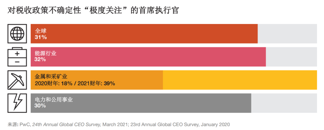 普華永道認為,稅收政策不穩仍是采礦和金屬企業面臨的主要挑戰,39%的礦業公司首席執行官非常擔心稅收政策的不確定性,這一比例是去年的兩倍,這些首席執行官比其全球同行更加關心稅收政策的變化。