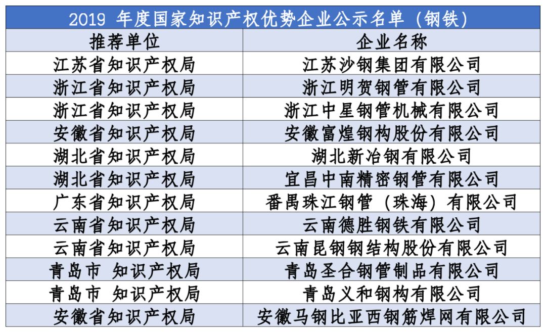 被評為“國家知識產權優勢企業”的鋼企整理如下——