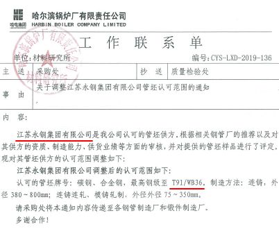 接下來 就跟著小編 一起去了解一下吧 高壓鍋爐管用鋼WB36 WB36主要應用于電站鍋爐的給水管道,因其優良的力學性能、抗蒸汽腐蝕性能及焊接性能使其在歐洲、非洲、亞洲等多個地區得到廣泛使用。 哈爾濱鍋爐廠有限責任公司隸屬哈爾濱電氣集團公司,始建于1954年,是中央直接管理的關系國家安全和國民經濟命脈的國有重要骨干企業之一,被譽為共和國裝備制造業“長子”,通過哈鍋的認證是WB36進入國內市場的必經之路。 WB36含有較多的Cu元素,防止Cu元素引起的表面裂紋是開發此鋼種的難點。為解決這一問題,永鋼集團技術團隊深入研究,層層檢測,發現在含銅鋼中加入一定量的Ni,能夠防止銅脆現象的發生,經過查閱相關文獻資料、不斷試驗將Ni與Cu的比例調整至大于2:1,有效的防止了銅脆現象的發生。 2019年3月15日,在啟動高壓鍋爐管用鋼WB36的認證后,永鋼集團連鑄圓坯經過成品成分檢測低倍檢測合格后,送樣哈鍋,經過對方一系列的檢驗,產品各項指標符合要求,就此通過哈鍋認證。 WB36通過哈鍋的認證標志著永鋼集團進軍國內高壓鍋爐鋼領域又有了新的突破,為公司產品提檔升級增添了新動力。近年來,永鋼集團圍繞“普轉優、優轉特、特轉精”的戰略目標,堅定不移走轉型、創新之路,不斷加大研發投入力度。2019年上半年,永鋼集團加快高端產品開發步伐,進一步優化產品結構,在新品研發、裝備技改等方面取得了豐碩成果。 4月,永鋼電站鍋爐用T91圓鋼通過東方鍋爐二方認證。 4月,抗腐蝕油井管29CrMoVNb通過C110級抗腐蝕試驗。 5月,起重機吊臂用鋼CB770QL通過下游客戶檢測。 開發B350B、S550A、34CrNiMo、X80等27個新牌號。 7月,永鋼鐵路車軸用鋼順利通過美國鐵路協會認證,正式邁入軌道交通用鋼領域。 8月,永鋼集團高壓氣瓶鋼4130X連鑄圓坯獲得國內市場準入資格。 永鋼一直秉承“創新是第一動力”的理念,不斷加快企業創新步伐,夯實企業轉型升級發展之路。截至2019年9月底,永鋼集團累計獲得授權專利647件,其中授權發明專利243件。在科技創新、轉型升級的道路上,永鋼永不止步!