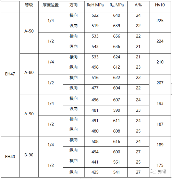 可見,無論是50mm厚、還是80mm、90mm厚的EH40、EH47厚板鋼的強(qiáng)度性能及硬度性能均滿足規(guī)范標(biāo)準(zhǔn)的要求,并且具有一定的富余量。采用同一成分A軋制的EH47、厚度分別為50、80、90mm厚度的鋼板,可以看出隨著厚度增加,強(qiáng)度有下降,同時在板厚度1/2和1/4處的強(qiáng)度差異略有增加。但硬度上的差異比較明顯,同一成分軋制不同厚度的鋼板,硬度最大相差30Hv10。而不同成分軋制的EH40、EH47的90mm厚鋼板,由于EH40有更低的Ceq,強(qiáng)度、硬度低于EH47同等厚度鋼板。