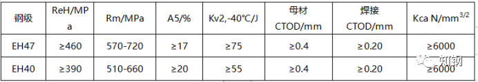 1為主要船級社對超大型集裝箱船用EH47的性能要求,可見與普通船板相比,除了材料的低溫沖擊要求提高外,在衡量材料的疲勞、止裂性能方面提出了額外的嚴(yán)格要求。
