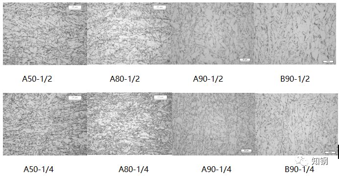 同時,由于厚度的差異,80mm、90mm厚的鋼板的板厚度1/2和1/4的強(qiáng)度性能有一定差異,這種差異在微觀組織上也有一定的表現(xiàn),如圖1所示。由于變形在厚度方向的不均勻分布及冷卻強(qiáng)度的不同,越接近鋼板表面的組織越細(xì)小,針狀鐵素體的比例也越高。這種組織上的差異影響了力學(xué)性能。