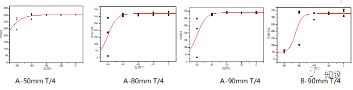 1為試制的EH40、EH47厚板的低溫夏比沖擊性能的結(jié)果。根據(jù)檢驗結(jié)果,可以看出A、B兩種成分的鋼、應(yīng)用同一成分A軋制的不同厚度EH47鋼板在-40°C時都具有較高的沖擊功,最低也在260J以上,由于軋制壓縮比不同,隨厚度的增加沖擊功略有下降。不同Ni含量相同厚度規(guī)格的EH40、EH47在-40°C時的沖擊功大小差別不大,沖擊功轉(zhuǎn)變曲線的上平臺幾乎沒有差別。但由于壓縮比不同及Ni含量不同導(dǎo)致的低溫韌性差異在夏比沖擊的連續(xù)溫度韌脆轉(zhuǎn)變曲線和隨后的雙重拉伸測定Kca數(shù)值的試驗中表現(xiàn)明顯。這也就是為什么不能單純用低溫夏比沖擊功來衡量止裂鋼的低溫性能的原因。