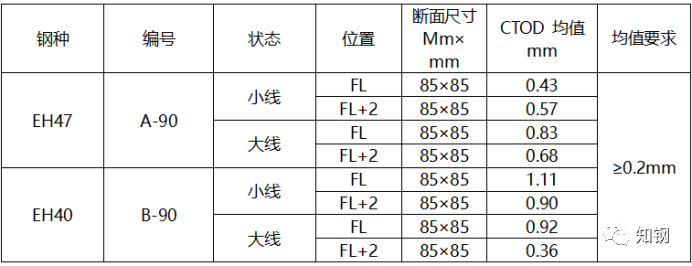 試驗按照BS7448標(biāo)準(zhǔn)進(jìn)行 ,采用全厚度尺寸試樣。試驗結(jié)果如表3所示。根據(jù)試驗結(jié)果可以看出同一成分軋制厚度分別為50、90mm的EH47、EH40厚鋼板,母材的-10°C的CTOD性能結(jié)果差異不大,δ值都在1.0mm以上。焊接接頭的CTOD性能在-10°C大于0.20mm。試驗結(jié)果表明研制的EH40、EH47鋼板,厚度規(guī)格從50~90mm的CTOD性能完全滿足船級社指南要求的數(shù)值。