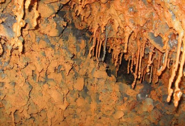 滴落區(qū)內(nèi)含鐵爐料由于溫度的升高呈現(xiàn)出由固態(tài)和軟熔態(tài)向液態(tài)的轉(zhuǎn)變。低落的過(guò)程包含軟熔向液態(tài)的轉(zhuǎn)變、液滴的長(zhǎng)大、滴落等階段。下圖是驟冷情況下滴落區(qū)的情形。