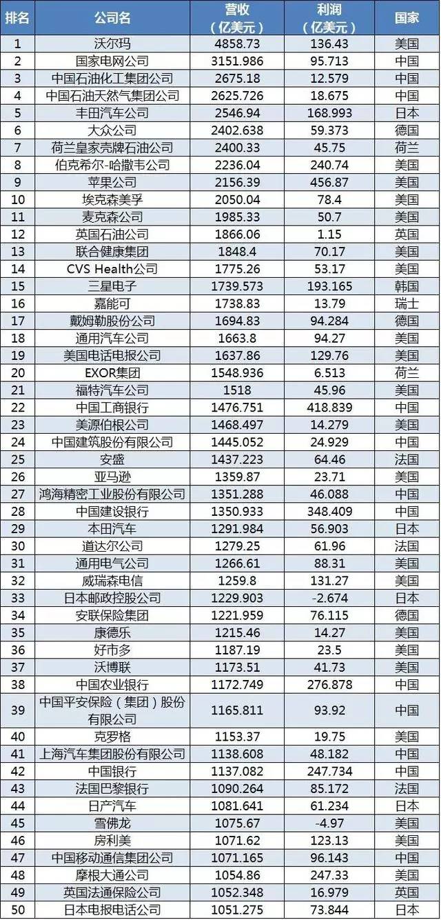 財富雜志7月20日發布世界500強排行榜。今年,沃爾瑪連續四年排名第一位。前三陣營中的其它兩家為中國公司——國家電網和中石化。中石油和豐田汽車分列第四和第五。