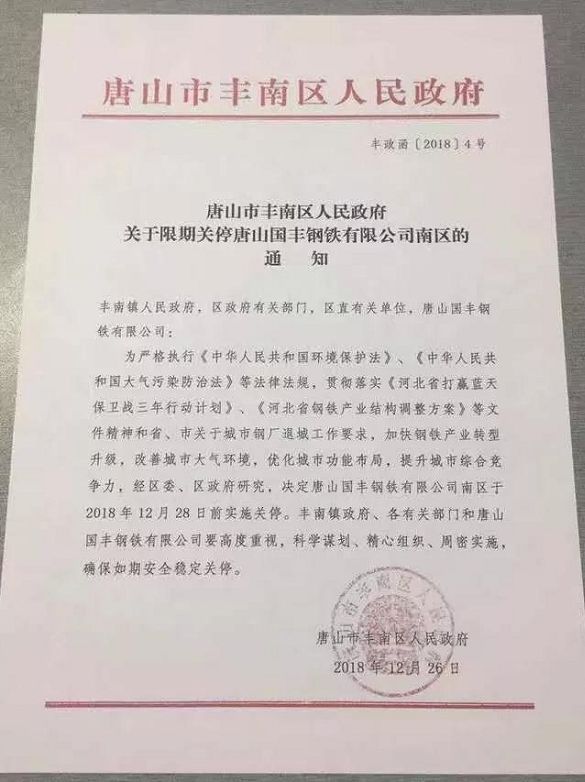 2018年12月26日,唐山市相關政府下發《關于限期關停唐山國豐鋼鐵有限公司南區的通知》,決定唐山國豐鋼鐵有限公司南區于2018年12月28日前實施關停。屆時繼2016年一季度退出的國豐北區200萬產能之后,再退出剩余的南區580萬噸產能。
