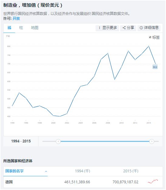 世界第四位是德國,2015年制造業增加值是7008.8億美元,是中國的21.57%