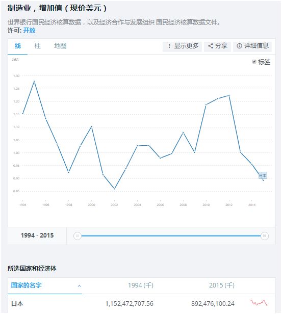 再看世界第三位的日本,2015年制造業增加值是8924.76億美元,差不多是中國的四分之一。對比日本1995年巔峰時期的1.279萬億美元,日本制造業在不斷萎縮。