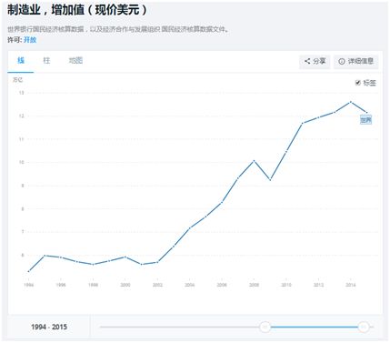 在世界銀行官網上,查詢中美日德2015年的制造業增加值(現價美元),可以看到,2016年全球工業產值是12.157萬億美元。