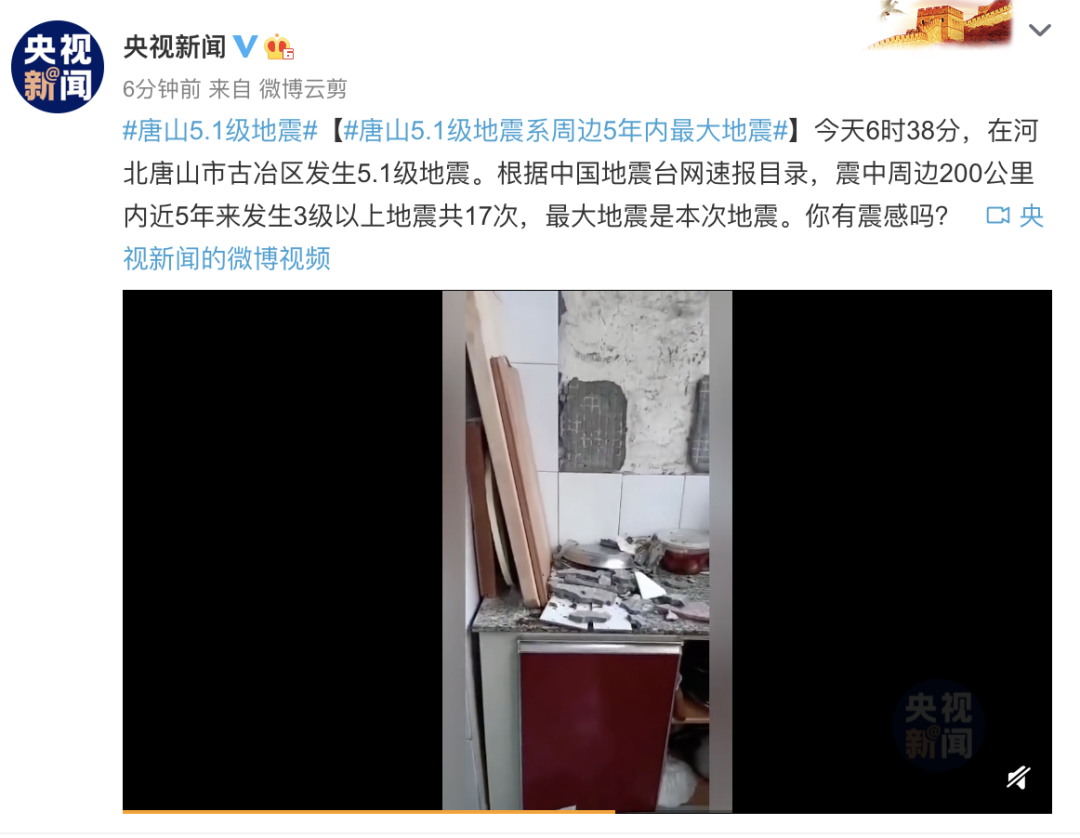 監控記錄唐山5.1級地震瞬間。視頻據網友,央視新聞發