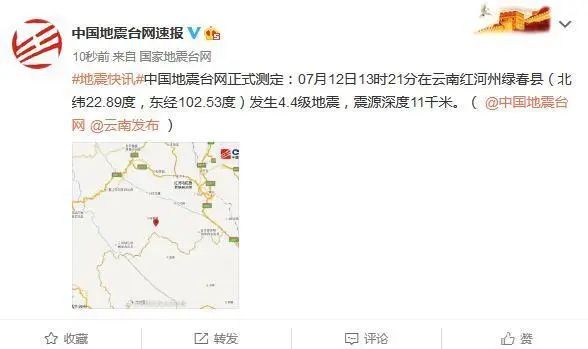 中國地震臺網正式測定:07月12日13時21分在云南紅河州綠春縣(北緯22.89度,東經102.53度)發生4.4級地震,震源深度11千米。