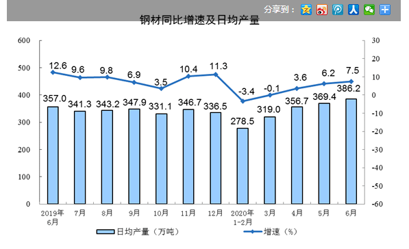 國家統(tǒng)計局數(shù)據(jù)顯示,2020年6月份我國粗鋼日均產(chǎn)量305.3萬噸,6月份生鐵日均產(chǎn)量255.5萬噸,6月鋼材日均產(chǎn)量386.2萬噸,環(huán)比5月份分別增長2.56%、2.42%和4.52%,再次全面刷新歷史新高。