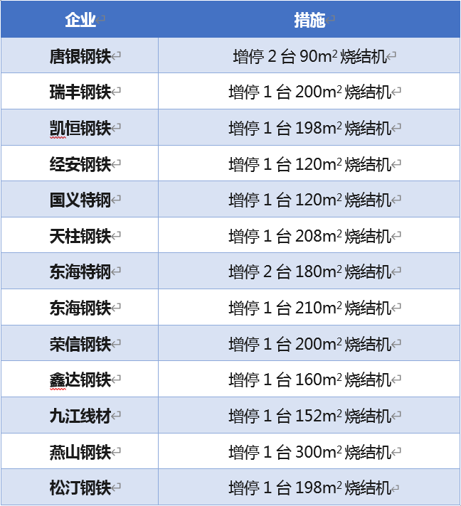 榮信鋼鐵1臺100㎡燒結(jié)機、1座1080m3高爐停產(chǎn)。鑫達鋼鐵1臺160㎡燒結(jié)機、1座1080m3高爐停產(chǎn)。九江線材2臺90㎡燒結(jié)機(不具備復(fù)產(chǎn)能力的1、2#除外)、1臺152㎡燒結(jié)機、2座1080m3高爐停產(chǎn)/。軋一鋼鐵1臺90㎡燒結(jié)機停產(chǎn),1座580m3高爐連 續(xù)停產(chǎn)60天。