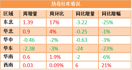 熱卷社會(huì)庫(kù)存壓力并不大,但本周華北、華南、西南市場(chǎng)出現(xiàn)小幅累庫(kù),與產(chǎn)量上升有一定關(guān)系。整體來(lái)看,西南地區(qū)庫(kù)存壓力略高于其他區(qū)域,較去年同期庫(kù)存水平高出21%。多數(shù)城市庫(kù)存接近或低于去年水平,板強(qiáng)長(zhǎng)弱仍會(huì)延續(xù)。