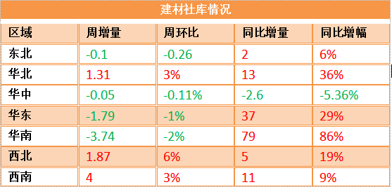 本周七大市場(chǎng)建材累庫(kù)分化,華北地區(qū)周庫(kù)存增加3%,較去年同期仍高出36%,華東和華南市場(chǎng)小幅去化,但庫(kù)存總量仍高于去年同期,尤其是華南市場(chǎng)同比增幅超過(guò)8成。目前僅華中地區(qū)庫(kù)存保持相對(duì)低位。雨水北抬對(duì)北方市場(chǎng)帶來(lái)一定影響。