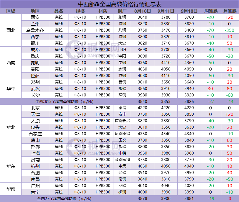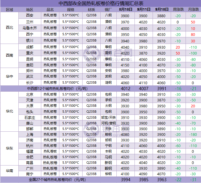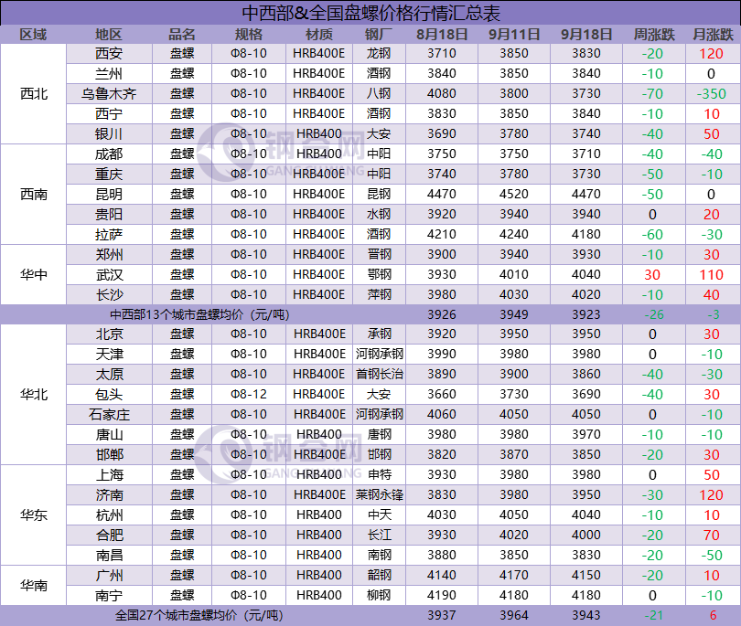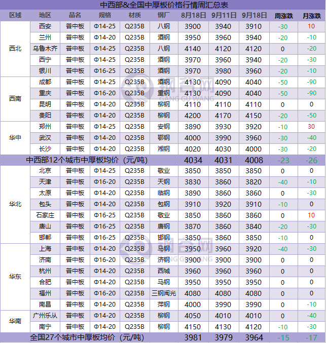 據(jù)鋼谷網(wǎng)數(shù)據(jù)中心監(jiān)測(cè),全國主要城市鋼材市場(chǎng)價(jià)格連續(xù)兩周下跌,本周跌幅稍有放緩,價(jià)格下跌空間10-70元/噸。截止9月18日,全國27個(gè)城市螺紋鋼均價(jià)3734元/噸,較上周跌24元/噸;全國27個(gè)城市高線均價(jià)3881元/噸,較上期跌19元/噸;全國27個(gè)城市盤螺均價(jià)3943元/噸,較上期跌21元/噸;全國27個(gè)城市熱軋板卷均價(jià)3963元/噸,較上周跌22元/噸;全國27個(gè)城市中厚板均價(jià)3964元/噸,較上期跌15元/噸。
