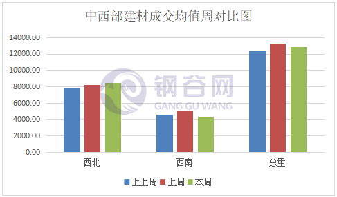 本周中西部31家流通商日均成交量較上周減少480.59噸,降幅3.62%。