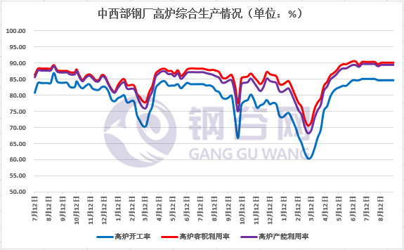 本期中西部地區(qū)鋼廠高爐產(chǎn)能利用率維持平穩(wěn),現(xiàn)階段鋼廠生產(chǎn)積極性較高,高爐開工率維持高位。