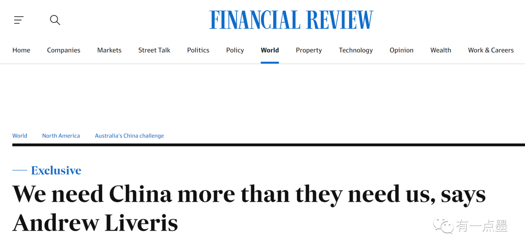 澳大利亞最著名的全球高管之一、前陶氏化學首席執行官安德魯·利弗里斯也提醒澳大利亞,莫把經濟關系和安全關系混為一談,以免(澳)面對中國崛起的“新現實”犯下錯誤。他還一語中的地提到:“我們需要中國多于中國需要我們”。