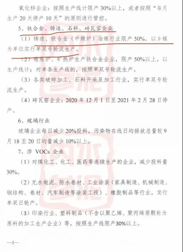 (1)鑄造、鐵合金(中頻電爐)冶煉行業限產50%,以鄉鎮為單位實行單雙號輪流生產。