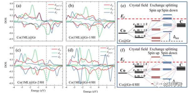 圖3.(a)-(d)分別表示不同氫濃度的石墨烯/Co界面中Co原子態密度;(e)和(f)分別表示Co/graphene和Co/graphene-4/8H兩種結構的能級示意圖