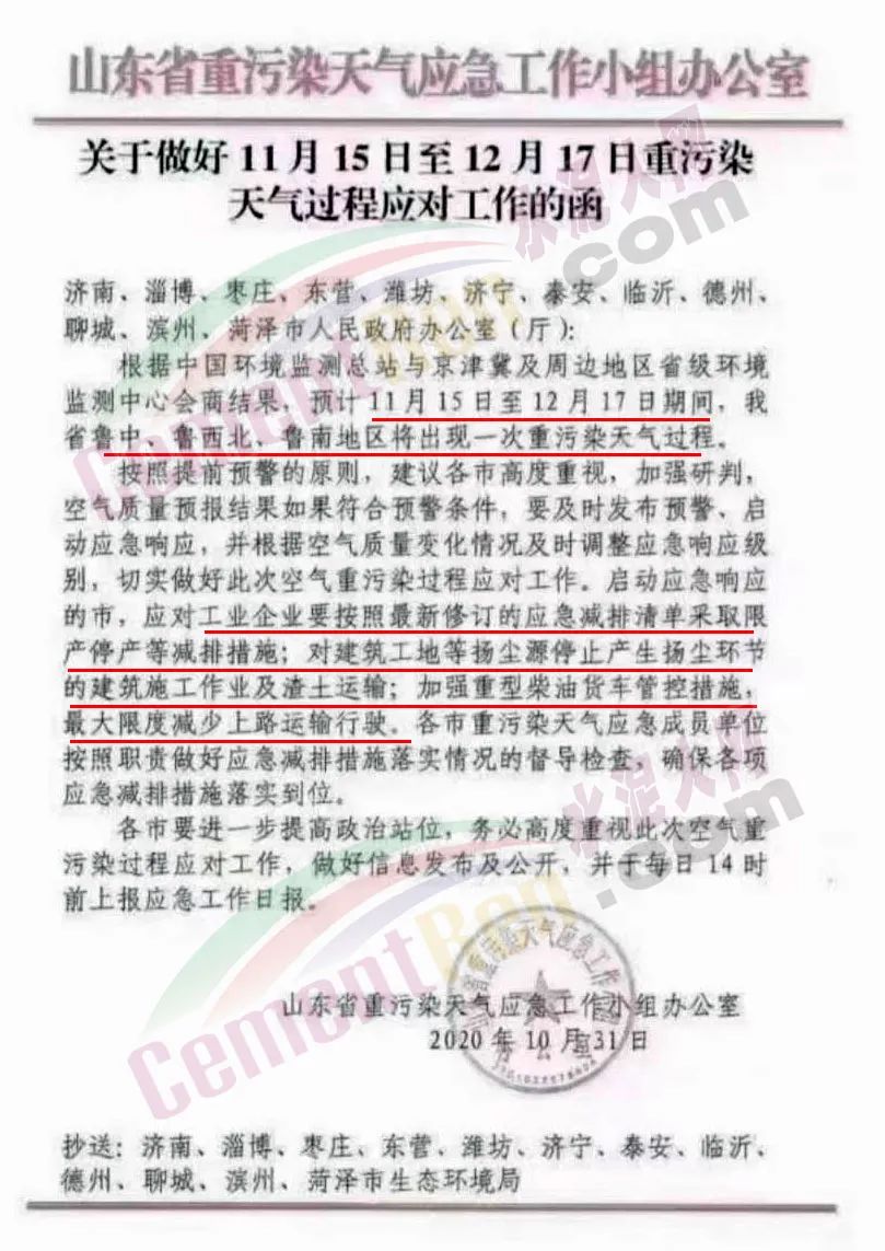 4.未參與績效評級的行業。完成治理任務(有組織排放、無 組織管控、在線監測聯網等)并通過現場核查驗收的企業不限產, 未完成治理任務的企業停產山東省重污染天氣應急工作小組辦公室發布了《關于做好11月15日至12月17日重污染天氣過程應對工作的函》給濟南、淄博、棗莊、東營、濰坊、濟寧、泰安、臨沂、德州、聊城、濱州、菏澤市人民政府辦公室(廳)稱,根據中國環境監測總站與京津冀及周邊地區省級環境監測中心會商結果,預計11月15日至12月17日期間,山東省魯中、魯西北、魯南地區將出現一次重污染天氣過程。啟動應急響應的市,應對工業企業要按照最新修訂的應急減排清單采取限產停產等減排措施;對建筑工地等揚塵源停止產生揚塵環節的建筑施工作業及渣土運輸;加強重型柴油貨車管控措施,最大限度減少上路運輸行駛。