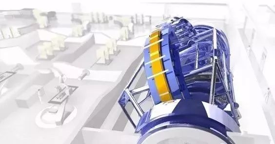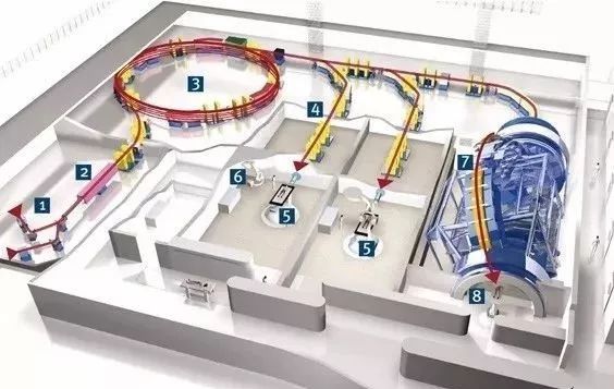 3. 同步加速器:六個(gè)60°磁鐵將離子束彎曲成圓形路徑。在大約一百萬(wàn)個(gè)軌道中,離子被加速到高達(dá)75%的光速。4.朝向治療室的方向:磁鐵引導(dǎo)并將光束聚焦在真空管中。5.治療室:光束通過窗口進(jìn)入治療室。患者被放置在治療臺(tái)上,該治療臺(tái)由計(jì)算機(jī)控制的機(jī)器人精確調(diào)節(jié)。
