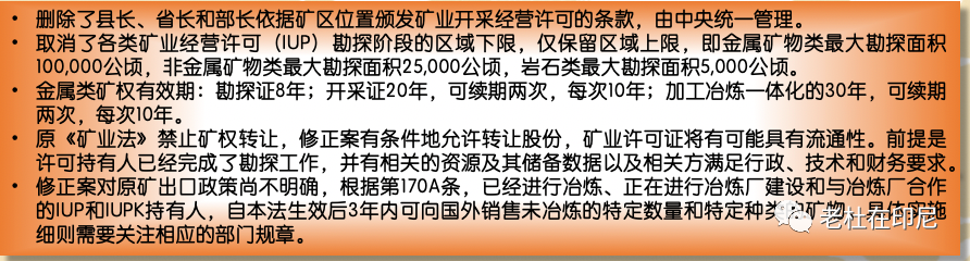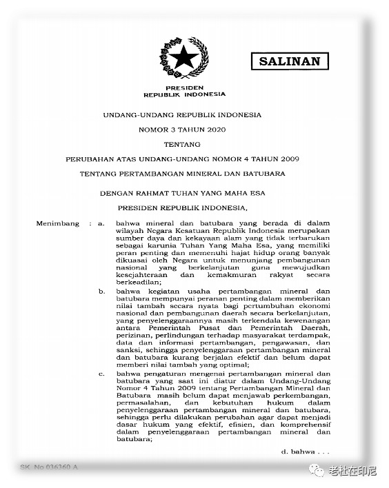 印尼政府自2015年起就開始研究修訂新《礦業法》,直至2020年5月12日該修正案被國會原則批準,旨在對礦產行業的相關活動進行高效、必要的規范。修正案涉及行政許可、許可延長、規范民采證以及國有礦企的部分變更。原《礦業法》共83條,現增加52條,刪除18條。作為國會批準通過的法律修正案,僅對礦業活動中的一些原則性問題進行了規范,具體實施中還需關注未來的相關政策、法規。