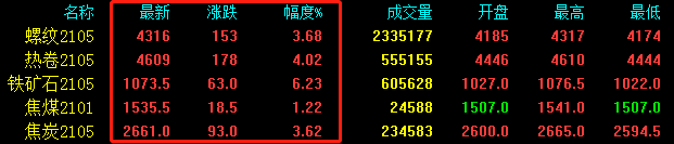 今日期鋼再度拉漲,收出一根大陽線。期螺上漲153收報4316,期卷上漲178,漲破4600到達4609高位。鐵礦石領(lǐng)漲黑色系,漲幅達到6.23%,上漲63收報1073.5,焦煤上漲18.5收報1535.5,焦炭上漲93收報2661。