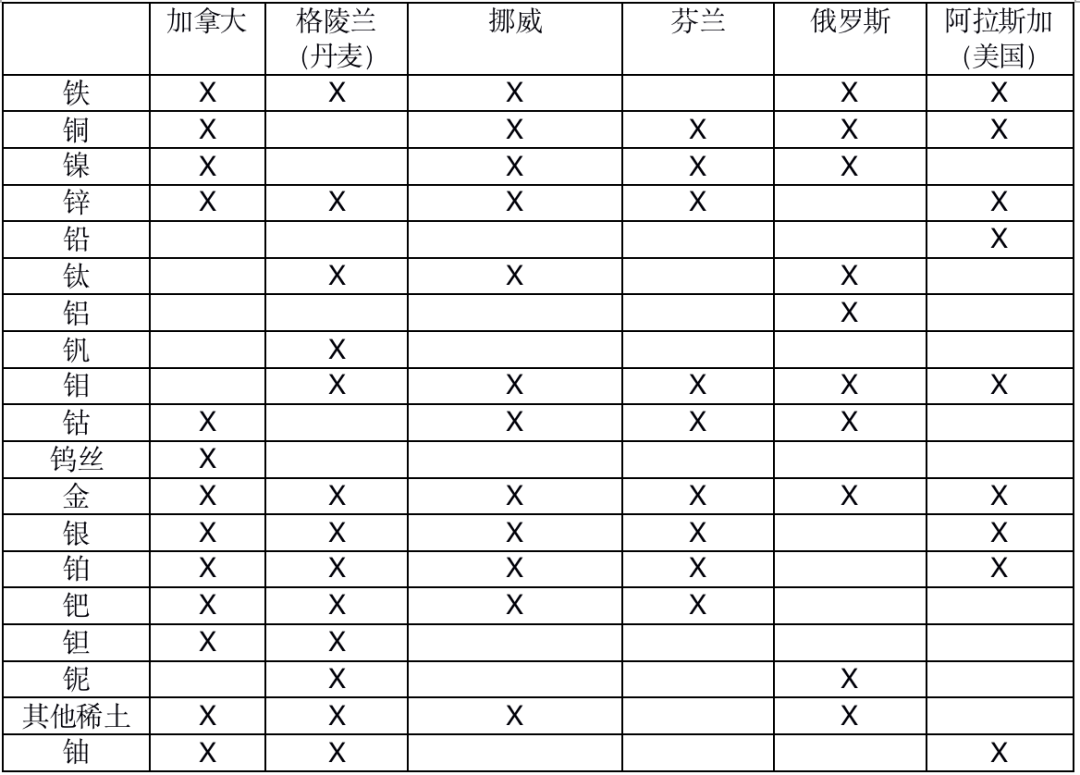 挪威地質調查局(NGU)于2016年進行的一次調查中,總結了北緯60°以上的已知礦床,如下表所示。目前其中一些礦藏正在開采。但是,由于觸達它們的困難和高昂的費用,許多資源仍未被開采。其中,最令人感興趣的是稀土元素(REE)和貴金屬,它們通常是現代電子產品和電池的重要組成部分。