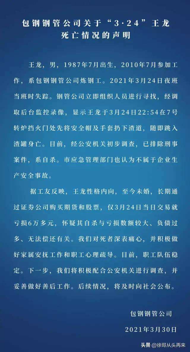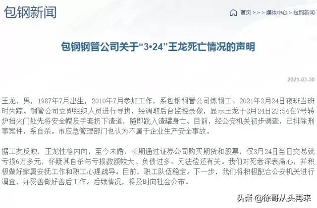 就鋼鐵廠來說,本來就辛苦,工作環境也很惡劣,但是領導又加重各種各樣的KPI指標和考核,職工壓力大,自然也是正常的,不過這個虧了6萬塊錢的股票,真的不至于自殺的,我們可以試算一下,如果一天能虧6萬,本金至少在幾十萬左右,實力也不小,所以,大家還是那句話,遠離鋼廠和股市,珍惜生命,一個要命,一個要錢。