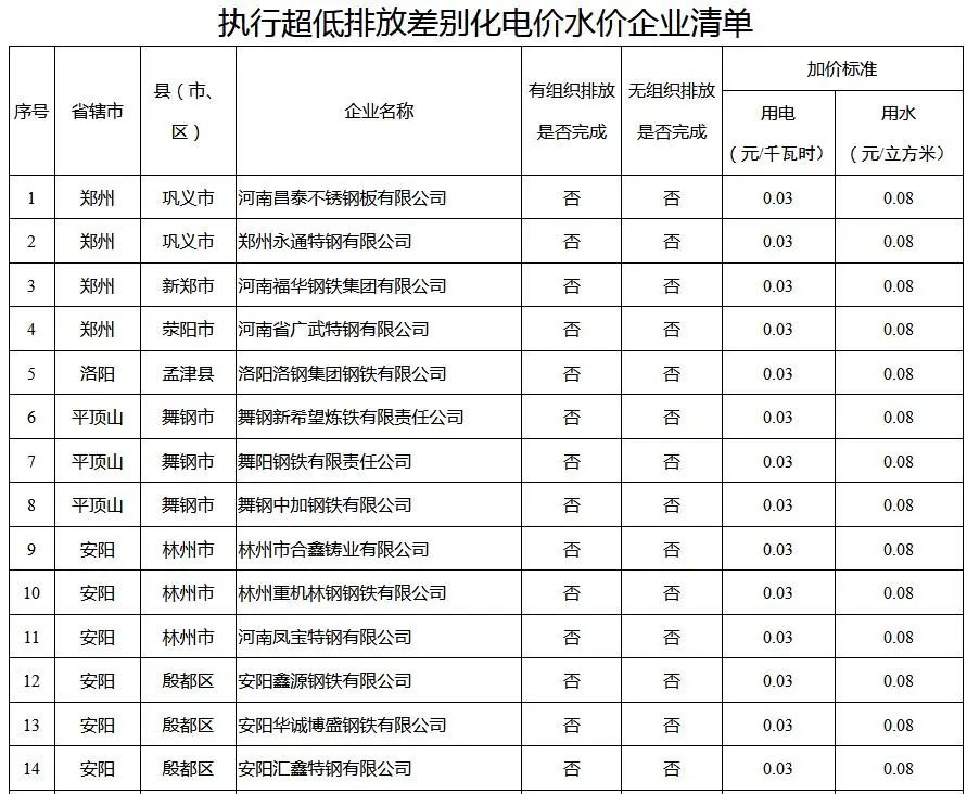 根據(jù)通知,河南省發(fā)改委決定自2021年7月1日起,對河南昌泰不銹鋼板有限公司等83家有組織排放、無組織排放均不達標(biāo)的企業(yè),用電加價0.03元/千瓦時(含稅,下同)、用水加價0.08元/立方米;執(zhí)行超低排放差別化電價、水價加價的企業(yè),在2021年7月1日后完成有組織排放、無組織排放改造并按程序經(jīng)評估監(jiān)測確認(rèn)后,由河南省生態(tài)環(huán)境廳提供名單、省發(fā)展改革委通知省電力公司和相關(guān)市縣發(fā)展改革部門,自通知的次月起停止執(zhí)行用電用水加價。