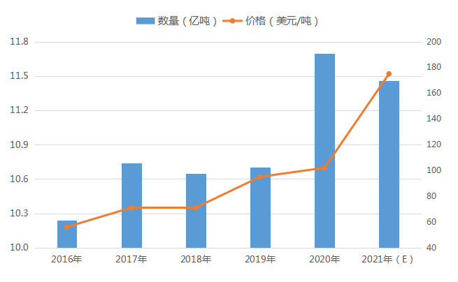 另根據(jù)國際期貨行業(yè)協(xié)會(Futures Industry Association(FIA))統(tǒng)計的2020年全球期貨成交量數(shù)據(jù)顯示,中國的大商所位居全球交易所期貨和期權(quán)成交量排名第7位,其鐵礦石期貨交易則以284,630,172手(折合284.63億噸)位居全球金屬期貨交易的第3位(2019年鐵礦石以29,658,011手(折合296.58億噸)位列次席)。2020年,大商所的鐵礦石相關(guān)期貨(權(quán))成交量和成交額則高達284.63億噸和21.59萬億元,由此計算的2020年大商所鐵礦石期貨價格平均價格為109.9美元/噸。而2020年全年普氏鐵礦石價格指數(shù)的平均值為108.9美元/噸,相差無幾。