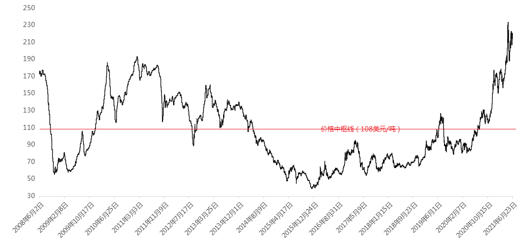 2018年5月至2021年6月期間內(nèi)的普氏鐵礦石價格指數(shù)均值為108.2美元/噸。同期普氏鐵礦石價格指數(shù)的平均價格為105.2美元/噸、區(qū)間內(nèi)普氏鐵礦石價格指數(shù)的標(biāo)準(zhǔn)差41.2美元/噸,即價格在64美元/噸至146美元區(qū)間均屬數(shù)據(jù)的正常分布。