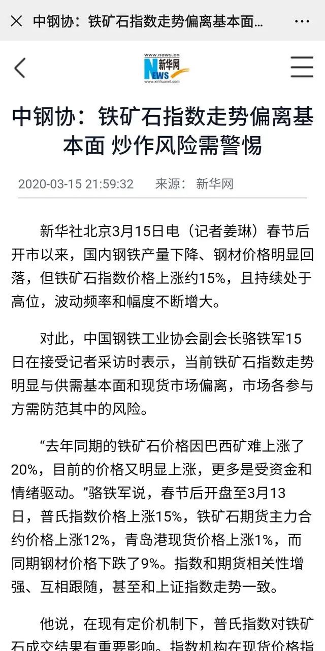 2020年3月15日晚上,新華網發布了一篇《中鋼協:鐵礦石指數走勢偏離基本面 炒作風險需警惕》的報道,文中引用了中鋼協副會長駱鐵軍的觀點。