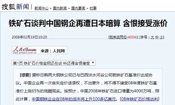 結果當中國開始大量進口鐵礦石時,鐵礦石價格就一路狂飆猛漲。特別是在2005年和2008年的時候,日本的新日鐵和三大礦山勾結,直接達成了漲價71.5%和65%的供貨協議,狠狠的宰了中國鋼鐵行業一把。