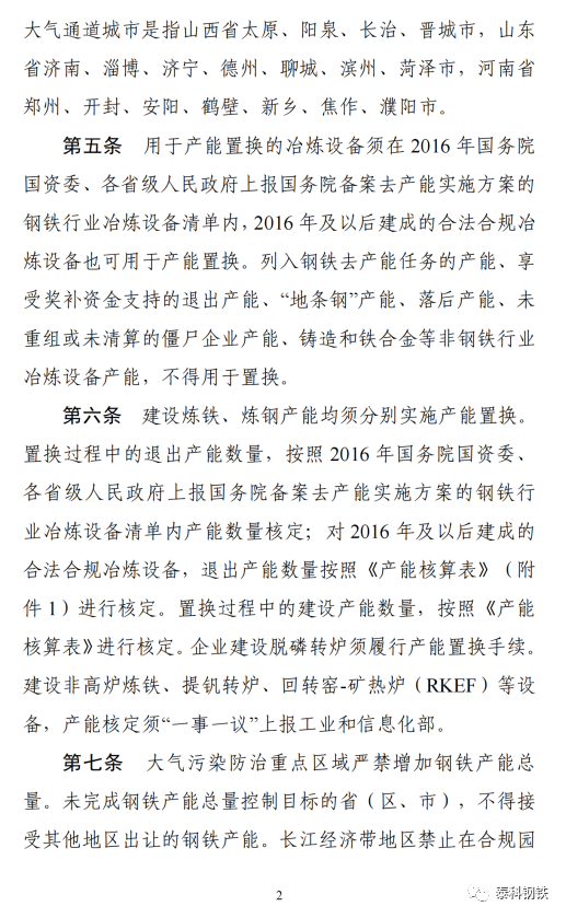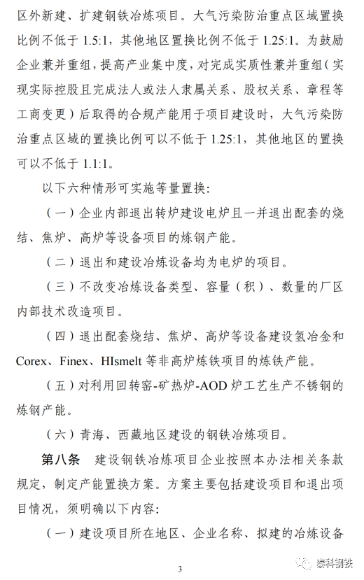 據工業和信息化部5月6日消息,為適應鋼鐵行業發展新形勢,貫徹新發展理念,構建新發展格局,更好地推動高質量發展,按照鋼鐵煤炭行業化解過剩產能和脫困發展工作部際聯席會議安排,工信部對原產能置換實施辦法進行修訂,出臺了《鋼鐵行業產能置換實施辦法》,自2021年6月1日起實施。大氣污染防治重點區域嚴禁增加鋼鐵產能總量。未完成鋼鐵產能總量控制目標的省(區、市),不得接受其他地區出讓的鋼鐵產能。長江經濟帶地區禁止在合規園區外新建、擴建鋼鐵冶煉項目。大氣污染防治重點區域置換比例不低于1.5:1,其他地區置換比例不低于1.25:1。