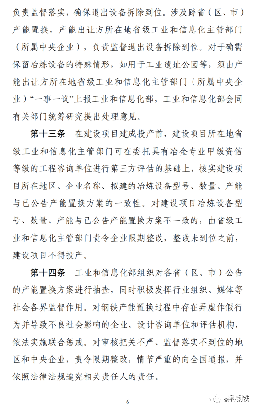 對發現未按要求實施產能置換、審核置換方案不嚴、落實產能置換不到位等違反辦法的情形,從兩個層面進行處理,一是對鋼鐵產能置換過程中存在弄虛作假行為并導致不良社會影響的企業、設計咨詢單位和評估機構,依法依規實施聯合懲戒,追究相關責任;二是對審核把關不嚴、監督落實不到位的地區和中央企業,責令限期整改,情節嚴重的向全國通報,并依法依規追究相關責任。