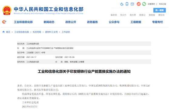 5月6日,工業和信息化部印發修訂后的《鋼鐵行業產能置換實施辦法》(下稱《實施辦法》),自2021年6月1日起施行。其中,《實施辦法》提出了大氣污染防治重點區域嚴禁增加鋼鐵產能總量,長江經濟帶地區禁止在合規園3區外新建、擴建鋼鐵冶煉項目等新增多項去產能要求。