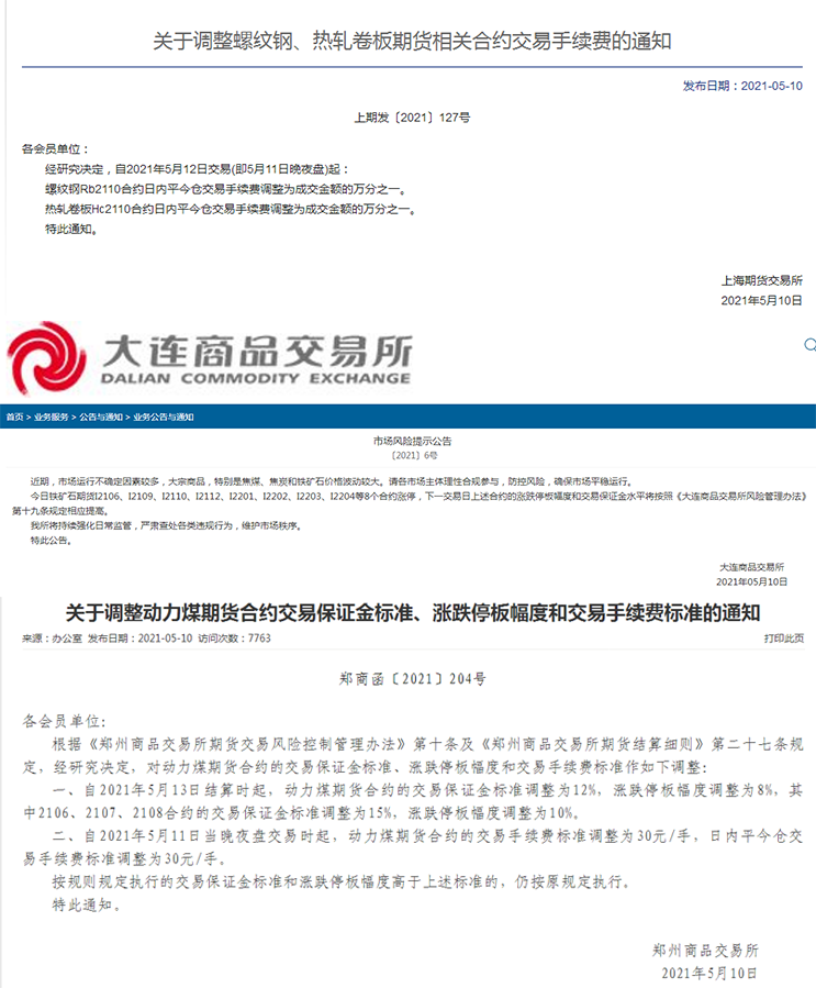 昨日黑色系螺紋和鐵礦石期貨迎來漲停潮,漲勢勢不可擋,面對如此瘋漲行情,上期所、大商所、鄭商所三大交易所緊急出手,三家交易所發布相關公告提示市場風險,給過熱的市場降溫。