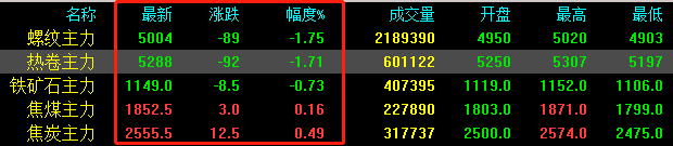今日期鋼繼續收跌,但午后跌幅收窄,鐵礦石回穩。期螺下跌89收報5004,期卷下跌92收報5288,鐵礦石下跌8.5收報1149,焦煤上漲3收報1852.5,焦炭上漲12.5收報2555.5。