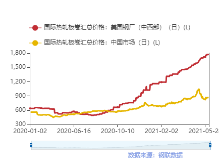美國中西部地區主流熱卷出廠價上漲至1785美元/噸,即11425元人民幣,價格創下近50年來新高。