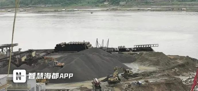 從高處俯瞰整片工地,可看到工地位于內海的南側,不少廠房建設完工,一些渣土車和推土機在廠區內來回運輸。在工廠的一側,可以看到一處被填埋的海域還沒有恢復原貌,三四臺挖掘機和推土機正在作業,一旁還有水泥攪拌車。