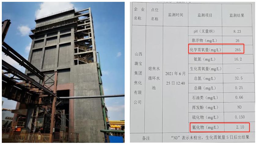 山西潞寶集團焦化有限公司仍在使用濕熄焦工藝(左);濕熄焦循環池廢水超標(右)